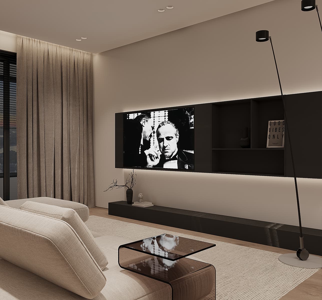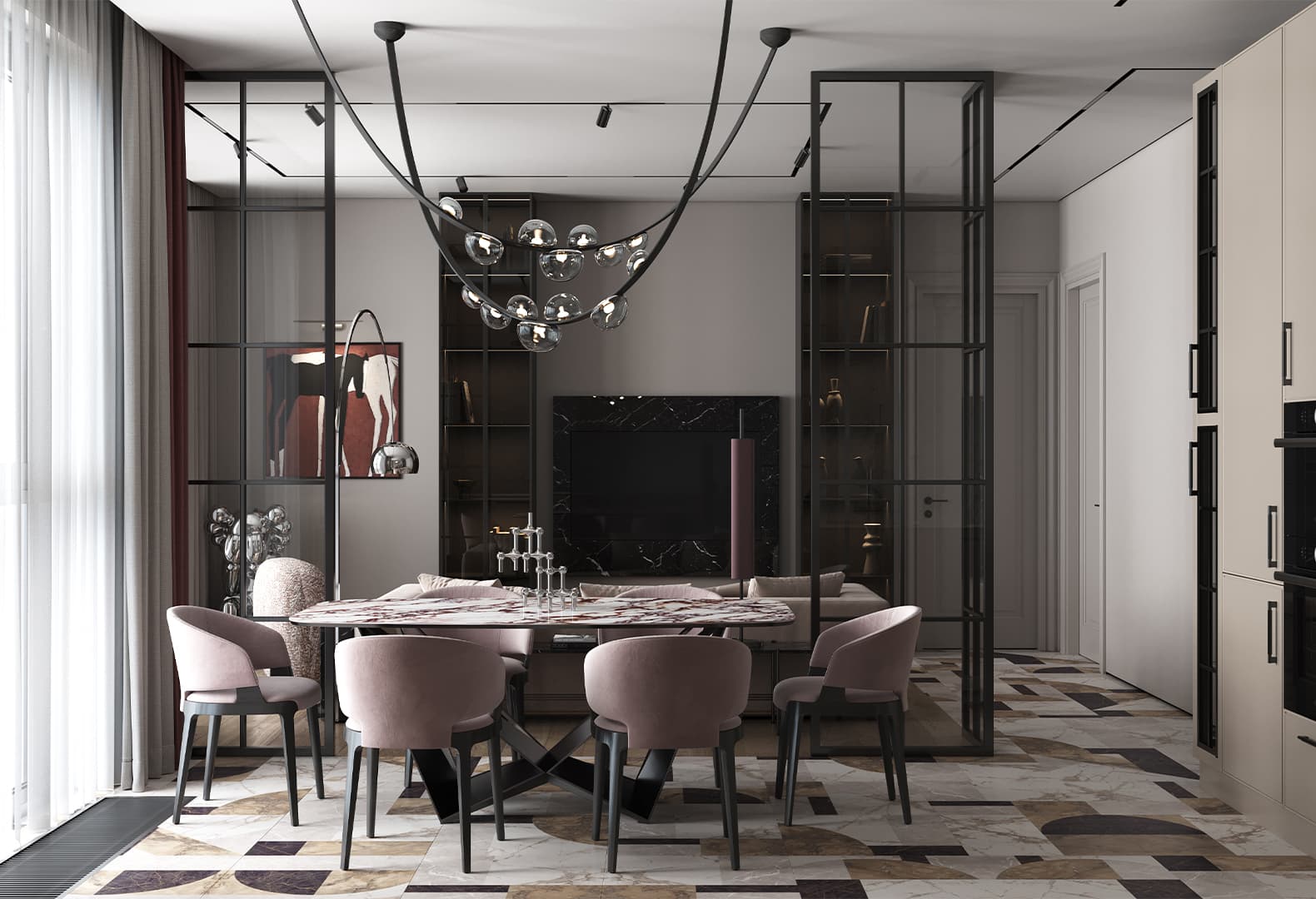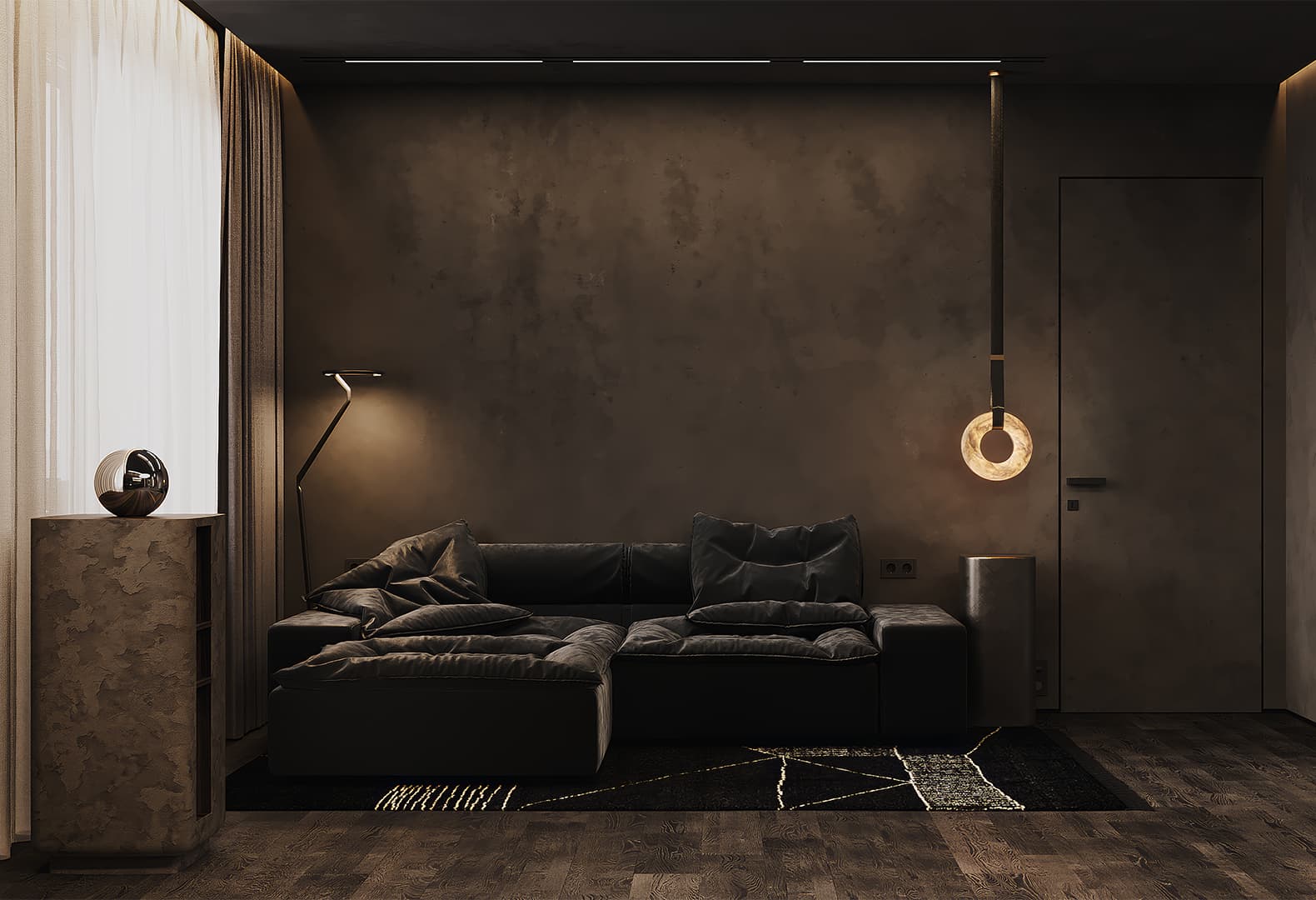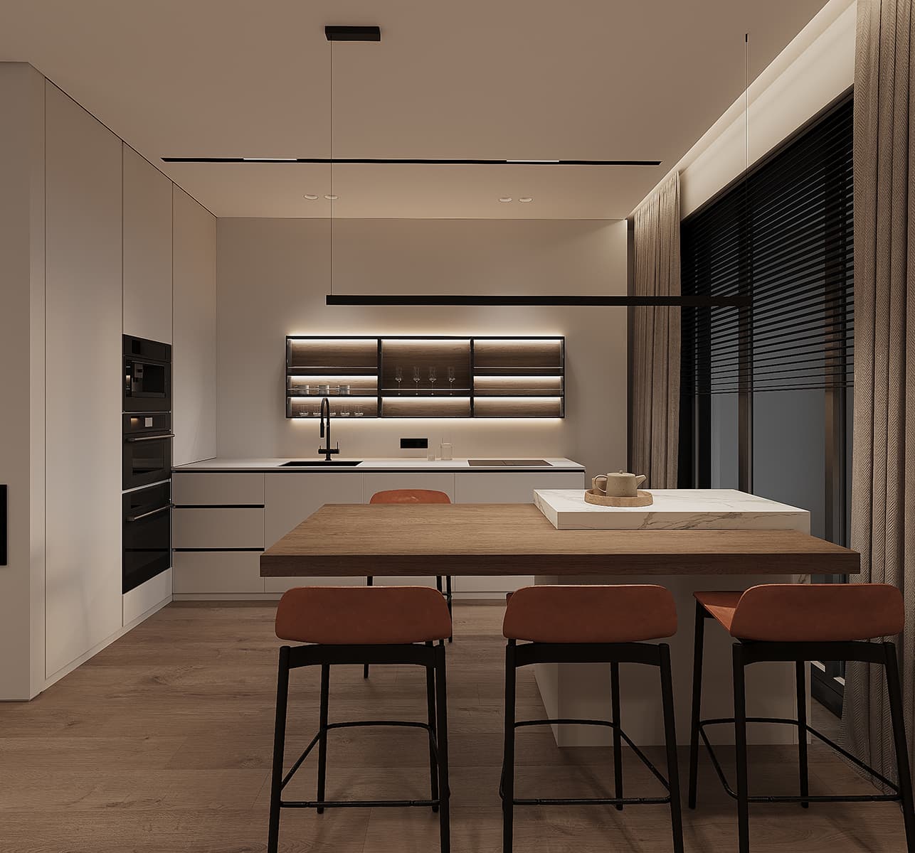 Концепция интерьера квартиры площадью 94 кв. м выполнена в эстетике минимализма, который соответствует характеру, статусу и образу жизни владельца — мужчины, занятого в банковской сфере. Автор объединила зоны кухни и гостиной для создания ощущения открытости и простора. Акцент в проекте сделан на базовых нейтральных тонах и природных материалах, а предусмотренные панорамные окна позволяют визуально расширить пространство.