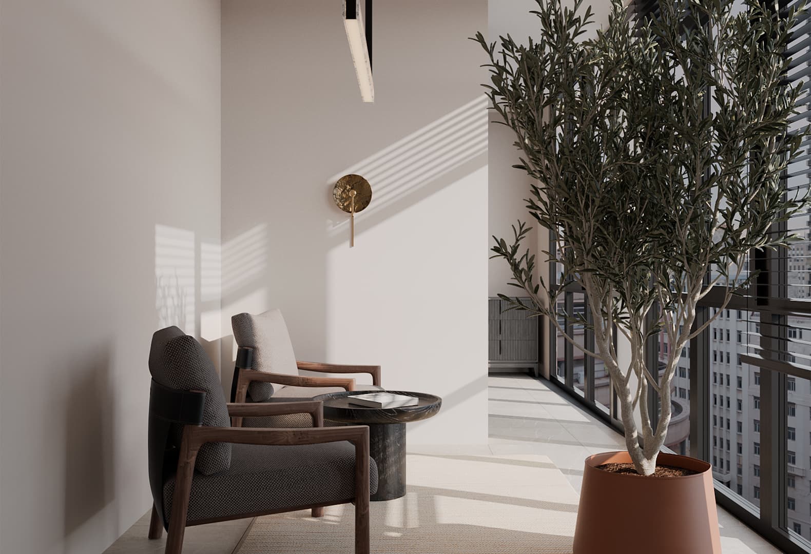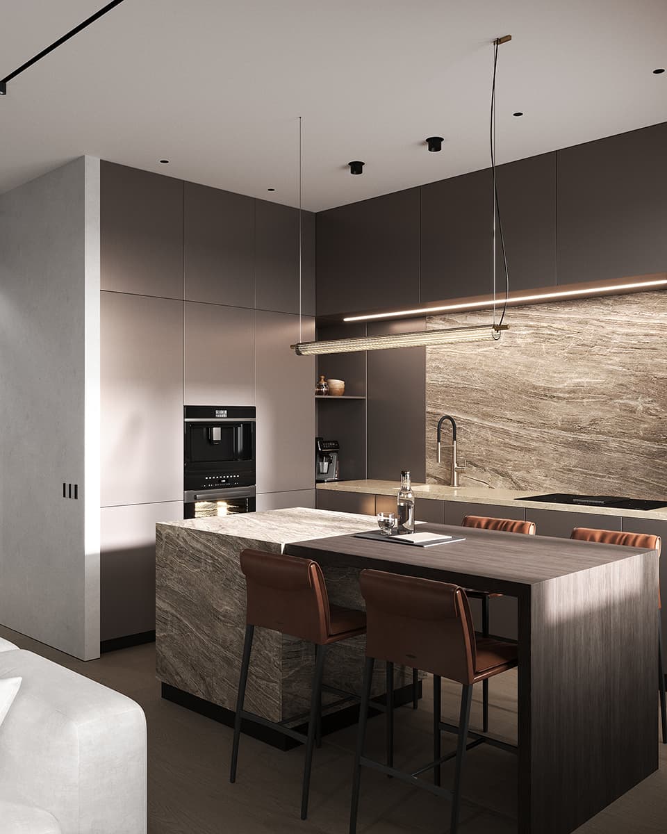 Главной задачей Ольги Купровой стало создание интерьера, приближенного по атмосфере к бутик-отелю. Дизайнер сделала акцент на ощущении визуальной тишины, но в то же время стремилась наполнить проект уникальными решениями. Форма, фактура и цвет здесь работают на атмосферу спокойствия и безмятежности. Сама Ольга описывает свою работу как интерьер, в котором нет ничего лишнего, но есть все необходимое.