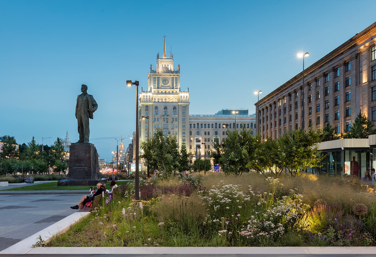 После реконструкции Триумфальной площади по проекту архитектурного бюро BUROMOSCOW с ландшафтным дизайном от компании ARTEZA она стала символом молодости, свободы и романтики. В ходе обновления была оптимизирована структура площади для удобства пешеходов, а озеленение и малые архитектурные формы помогли зонировать территорию. В результате пространство деликатно интегрировано в городской ландшафт, словно продолжая его естественные линии. Со стороны Садового кольца площадь приподнята на 1,5 м, создавая тихий остров вдали от потока машин. К уютному скверу площадь спускается широкими ступенями. Металлические качели и уличная мебель добавляют пространству современный акцент, не нарушая общей гармонии.
