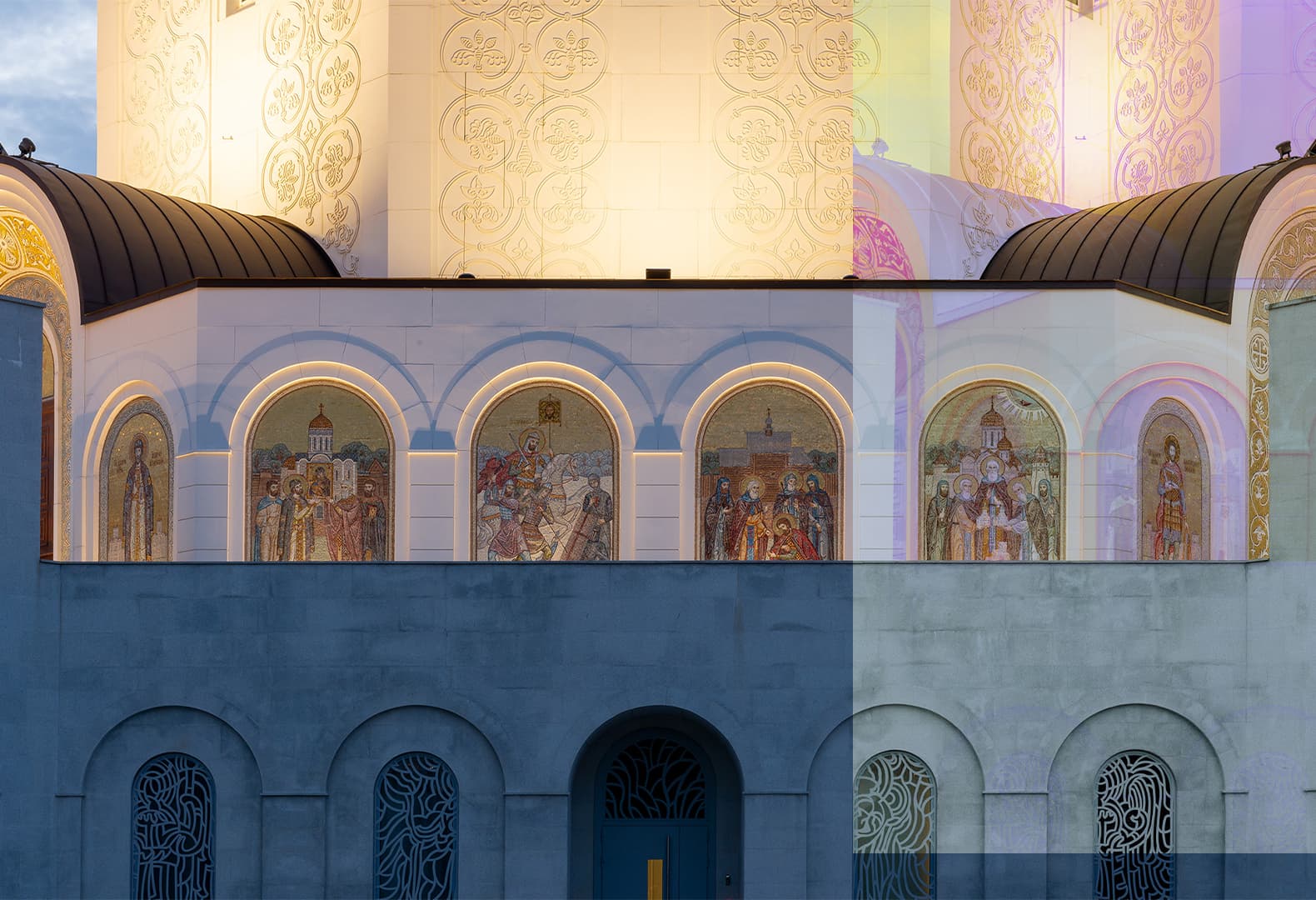 Белокаменный храм равноапостольного великого князя Владимира, созданный по проекту архитектурного бюро СПИЧ, отличает фасад с фактурным растительным орнаментом, благодаря которому классическая архитектура приобрела новый современный облик. Для храма было разработано световое решение, которое помогло сформировать особое восприятие сакрального через вечерний образ архитектуры. Архитектурное освещение помогает передать его чистоту и легкость. Кажется, будто здание парит над землей, устремляясь ввысь белоснежным фасадом. Это ощущение создается за счет того, что стилобатную часть, в которой располагается воскресная школа, решили не выделять светом. Контраст между темным нижним ярусом и белыми верхними ярусами в сумерках формирует визуальный эффект приподнятости здания. Такой прием подчеркивает возвышенный характер храма, а освещение входной группы обеспечивает композиционную связь между землей и небом.