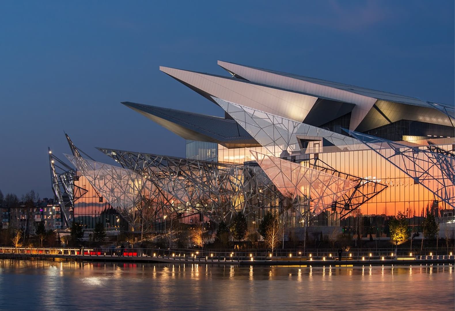 Архитектурная особенность фасада Театра Камала — треугольные панели, напоминающие лепестки «ледяного цветка». Вечером они эффектно подчеркиваются светом. Каждый лепесток конструкции уникален, поэтому световые решения для них разрабатывались индивидуально. Благодаря системам управления освещением здание театра превращается в динамичный объект с «эмоциями»: по заданным сценариям оно становится ярче во время мероприятий, создавая торжественную атмосферу, а после завершения событий переходит в ночной режим, экономя энергию.