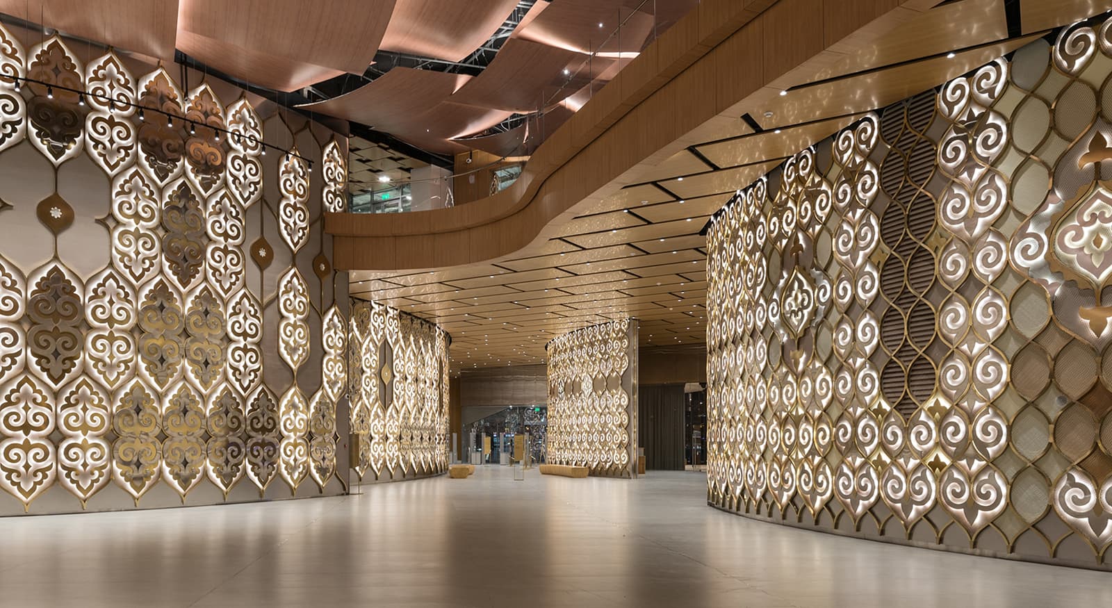 Стены театра украшены узорами, вдохновленными традиционными татарскими женскими украшениями. Днем лепестки взаимодействуют с естественным светом, меняя облик в зависимости от времени суток, а ночью оживают благодаря искусственному освещению. Контражурная подсветка подчеркивает детали и добавляет объем. Дополняет образ подвесная система прожекторов, повторяющая изгиб лепестков и создающая эффектные блики на золотых узорах.