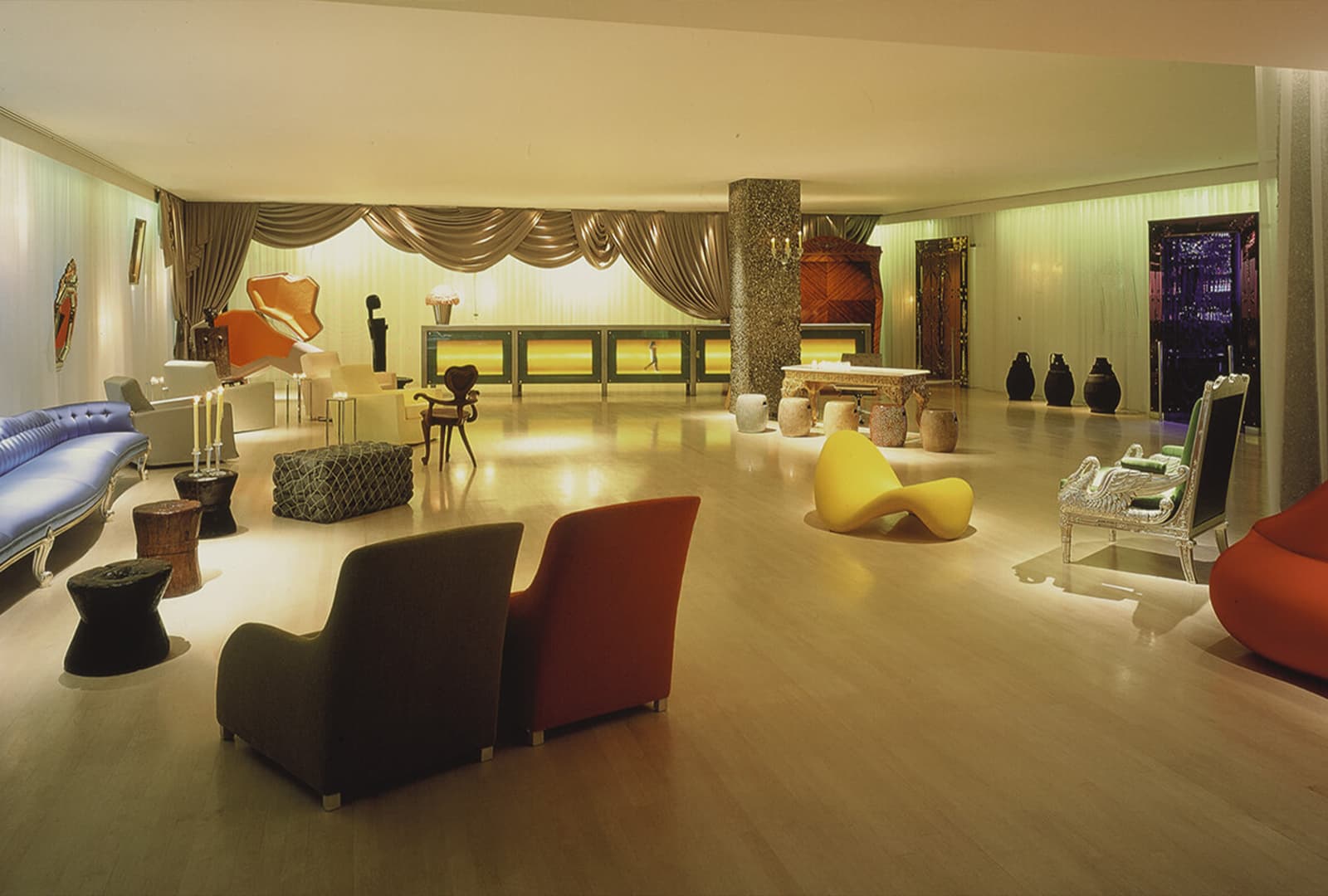 К примеру, бар Silencio в Париже — одно из самых ярких интерьерных воплощений идей Линча. Он сам участвовал в его создании, буквально перенес свои кинематографические приемы в физическое пространство. Темные зоны, резкие вспышки света, глубокие теплые оттенки создают эффект огня, напряжения, погружения в другую реальность. Еще одно ассоциативное решение — отель Sanderson в Лондоне, который оформлял именитый дизайнер Филипп Старк. В декоре использован текстиль густой сборки, который развешан прямо на стенах пространства. У посетителя создается ощущение, что за этими шторами спрятан другой мир, поэтому место кажется загадочным и заставляет подключать сразу несколько органов чувств.
