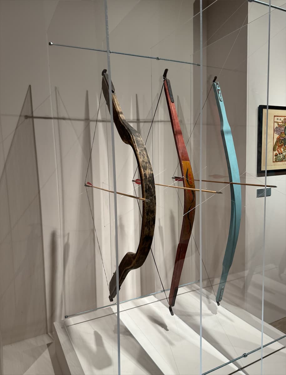 Диана Мачулина превращает старинные коромысла в стрелковые луки, показывая, как предметы и символы разных эпох могут быть переосмыслены в новых контекстах. Художница исследует женскую силу и демонстрирует, что культура одновременно хранит историческое наследие и открыта для новых интерпретаций.
