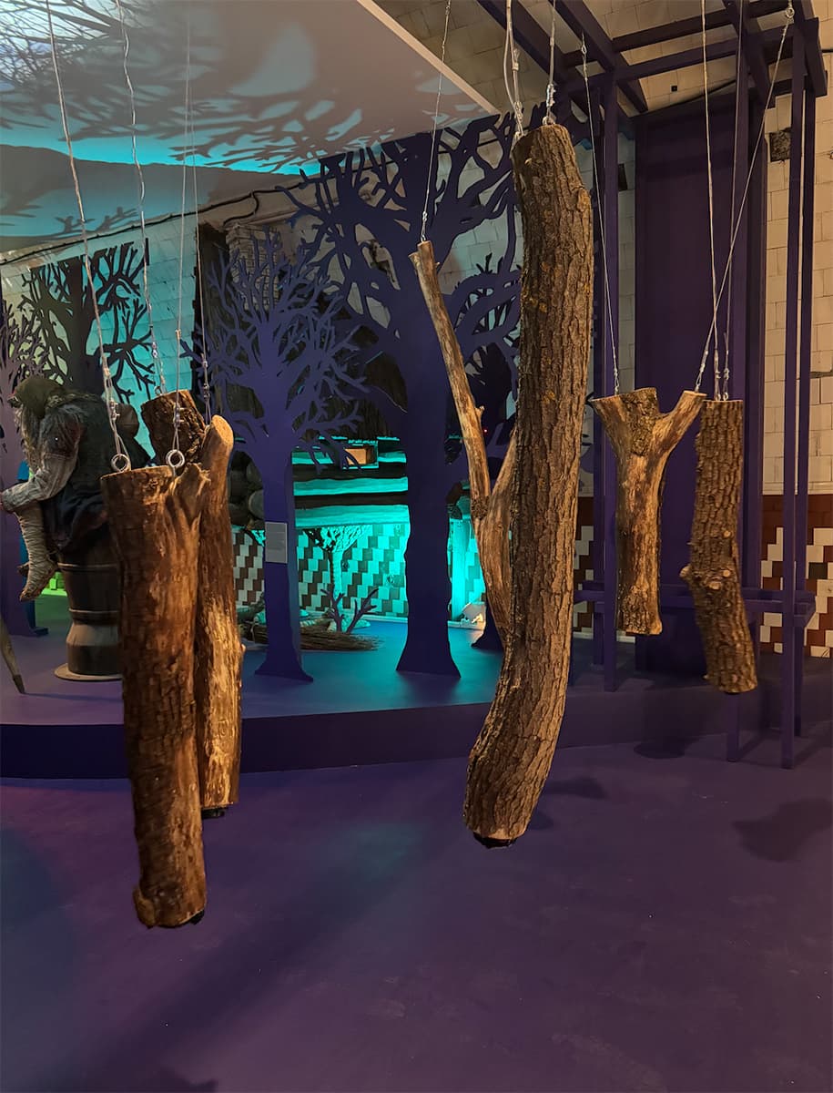 Мифологизация природы, свойственная архаическому мировосприятию, сохранилась в народных сказках, поэтому лес в них живет по своим законам и не подчиняется человеку. Дерево же становится символом жизни. Сегодня эта жизнь может принимать разные формы, объединяя органическое и искусственное начало. К этому отсылает работа Анны Комаровой post-. Из подвешенных стволов деревьев доносятся звуки, которые вместе образуют абстрактное звучание природы. Объекты воплощают пограничное состояние между живым и мертвым: у этих деревьев нет корней и связи с землей, при этом они звучат, наполненные искусственной, техногенной жизнью. Прикоснувшись или обняв одно из них, можно ощутить его подобный сердцебиению ритм.
