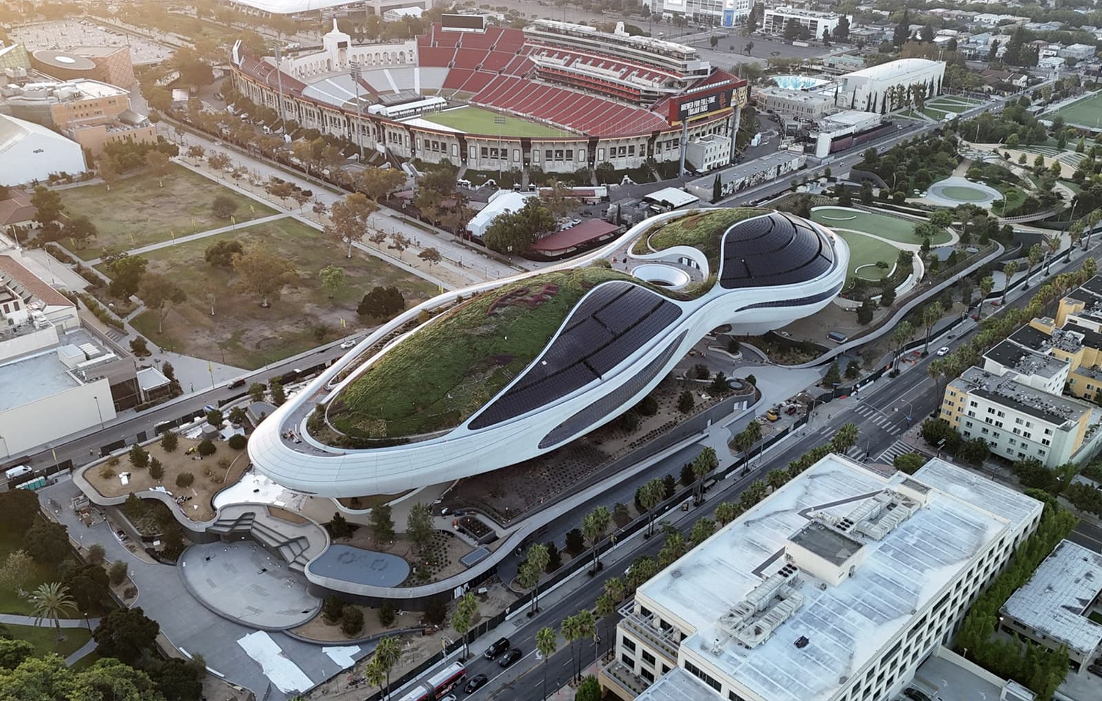 Музей, куратором которого выступает кинопродюсер и режиссер Джордж Лукас, вместит более 40 000 произведений, в том числе классические иллюстрации, муралы, комиксы, научно-фантастические образы и кинематографические артефакты. Фасад здания по проекту китайской студии MAD состоит из 1500 формованных панелей из армированного стекловолокном полимера. Архитекторы добились футуристичного силуэта за счет плавных линий и отсутствия острых углов. Массивный объем касается земли лишь в нескольких точках, что создает эффект парения в воздухе и придает ему визуальную легкость. В рамках проекта команда также преобразит территорию вокруг музея, высадив несколько сотен деревьев и предусмотрев удобную среду для прогулок. Открытие комплекса намечено на сентябрь 2026 года.