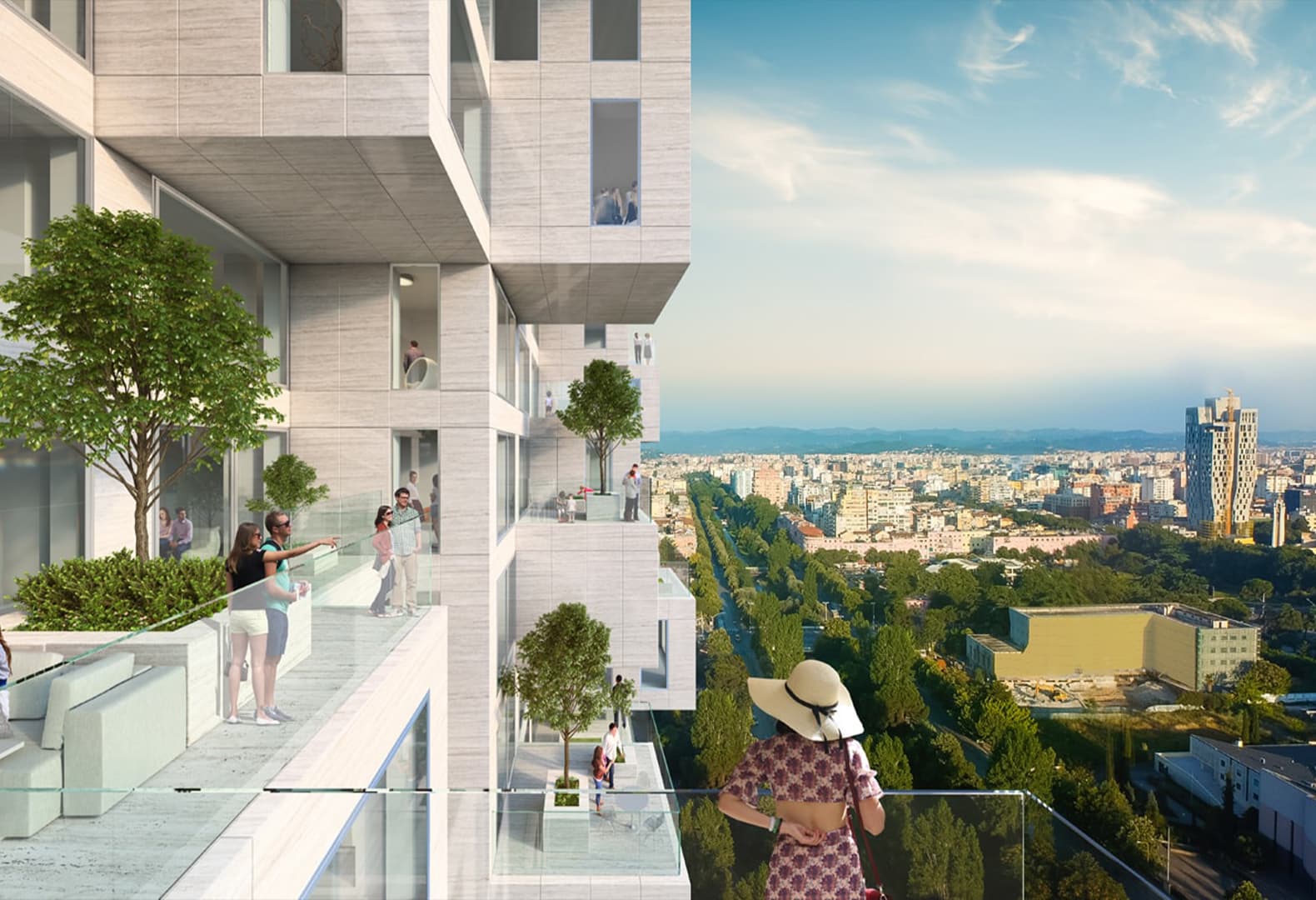 37-этажная башня Downtown One, строительство которой должно было завершиться в 2025 году, сочетает в себе жилые и офисные функции. Ожидается, что здание будет достигать 140 метров, что сделает его самым высоким в Албании. Геометрический фасад комплекса задуман нидерландской студией как пиксельная «карта» страны, на которой с помощью рельефа выделены отдельные населенные пункты. По словам архитекторов, эти консольные элементы не только имеют символическое значение, но и позволяют жителям комфортно общаться друг с другом, создавая ощущение вертикальной деревни. Как отмечает команда, жилой комплекс площадью 77 000 квадратных метров, в котором также расположатся магазины и рестораны, выступит импульсом к развитию центра Тираны.