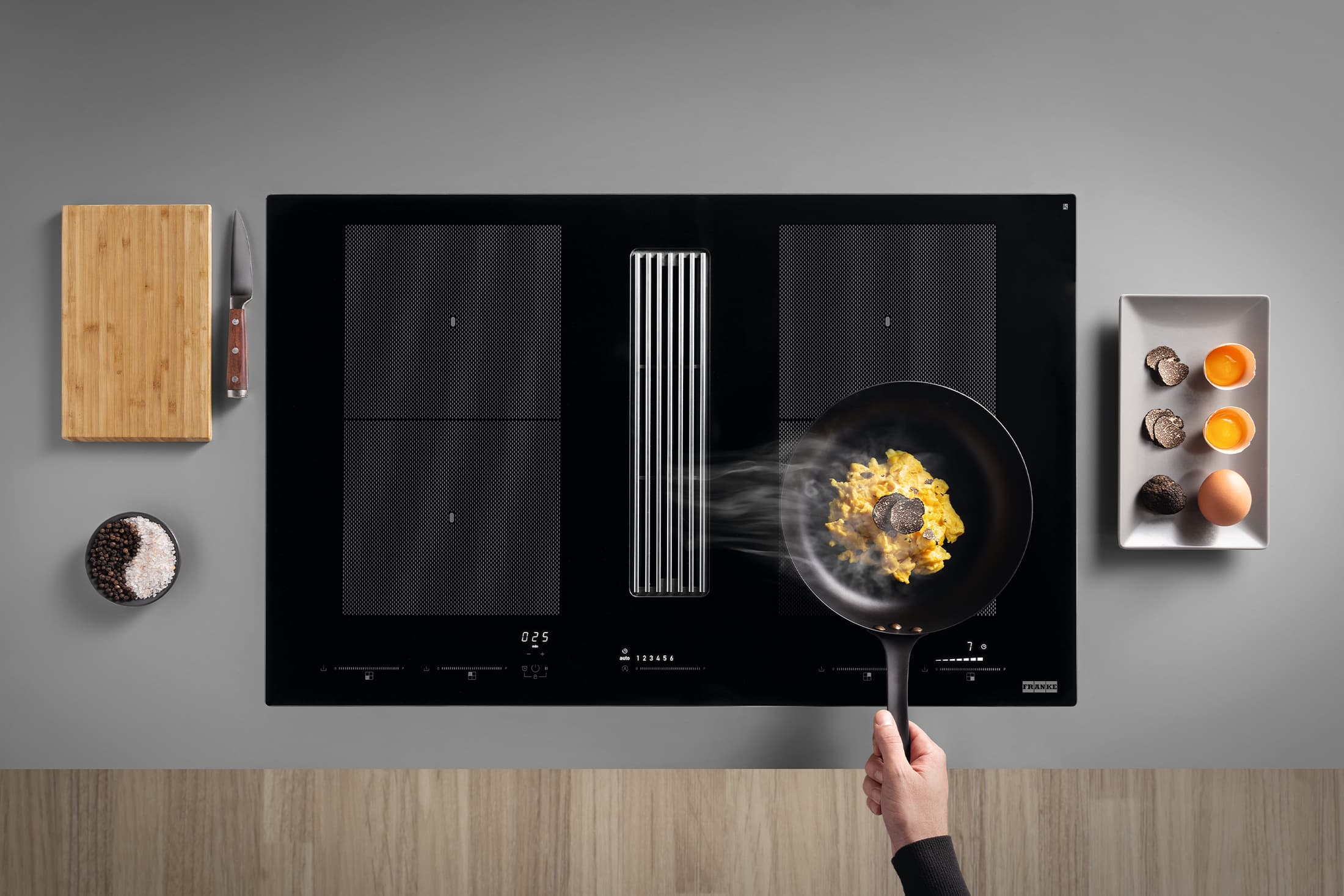 Варочная панель с интегрированной вытяжкой Mythos 2gether с помощью индукционного моста Flexi позволяет объединять смежные конфорки в пары для приготовления в крупной посуде. За безопасную эксплуатацию отвечает инновационная водонепроницаемая технология: случайно пролитая жидкость скапливается в специальном контейнере под варочной панелью. Вытяжка с производительностью 1000м³/час включается автоматически и очищает воздух в помещении площадью до 40 кв.м.